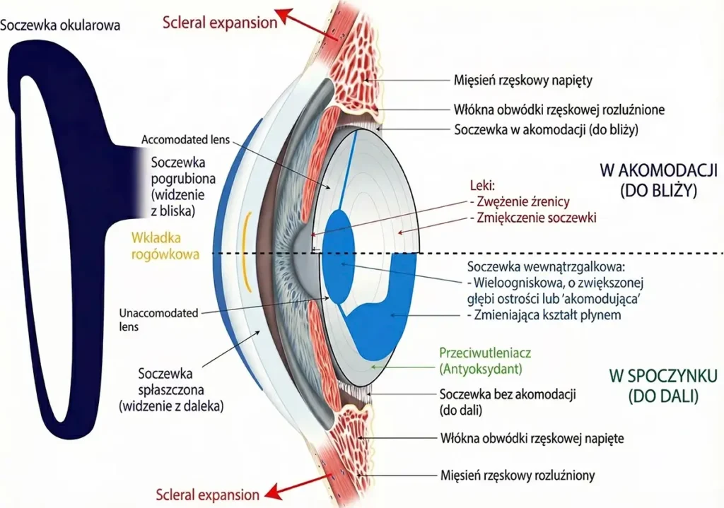 • Warto wiedzieć: Istnieje zjawisko zwane pseudoakomodacją. Opisuje ono sytuację, w której osoba starsza nadal widzi z bliska mimo braku rzeczywistej akomodacji soczewki (np. dzięki głębi ostrości przy wąskiej źrenicy).
